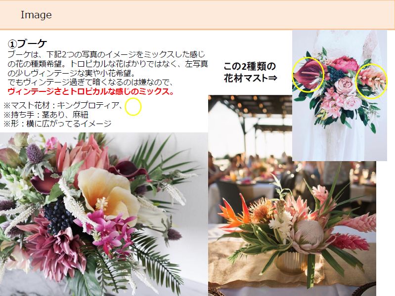 イメージシートに記載している通り、マスト花材・持ち手・形を細かく記載して