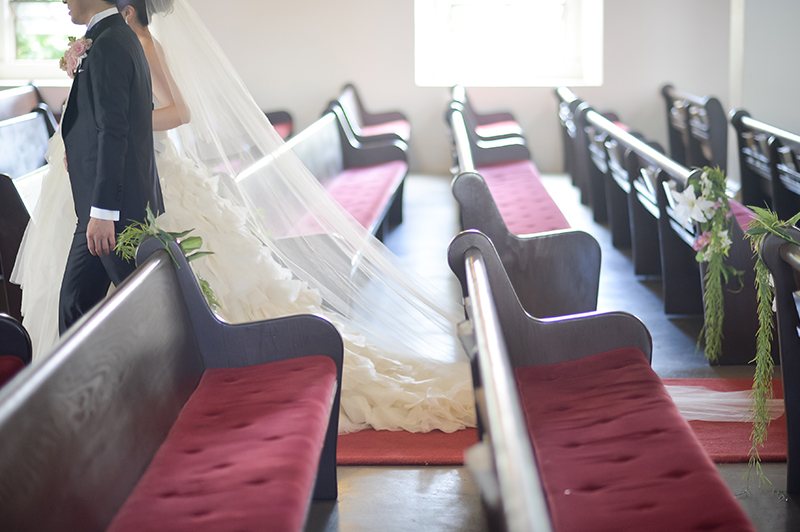 調度品や深紅のバージンロードが全体をシックにひきしめています。